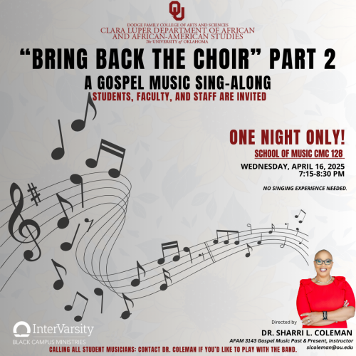 The department is interdisciplinary with faculty representing the Arts, Humanities, Sciences, and Social Sciences. Students majoring in AFAM learn from award-winning professors who are researchers and scholars active in their respective fields. In the spirit of our namesake, Clara Luper, AFAM has a community-engaged mission. All AFAM majors enroll in a Senior Capstone course with an embedded internship component. Through our scholarship, teaching, and service we aim to facilitate dialogue between those on campus and in the community via education and civic engagement. We sponsor and co-sponsor campus events, partner with local community organizations on initiatives, and faculty have received grant funding for community-based research.