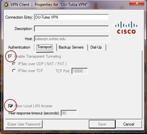 - Click on the Transport tab and check "Enable Transparent Tunneling" and "Allow Local LAN Access"