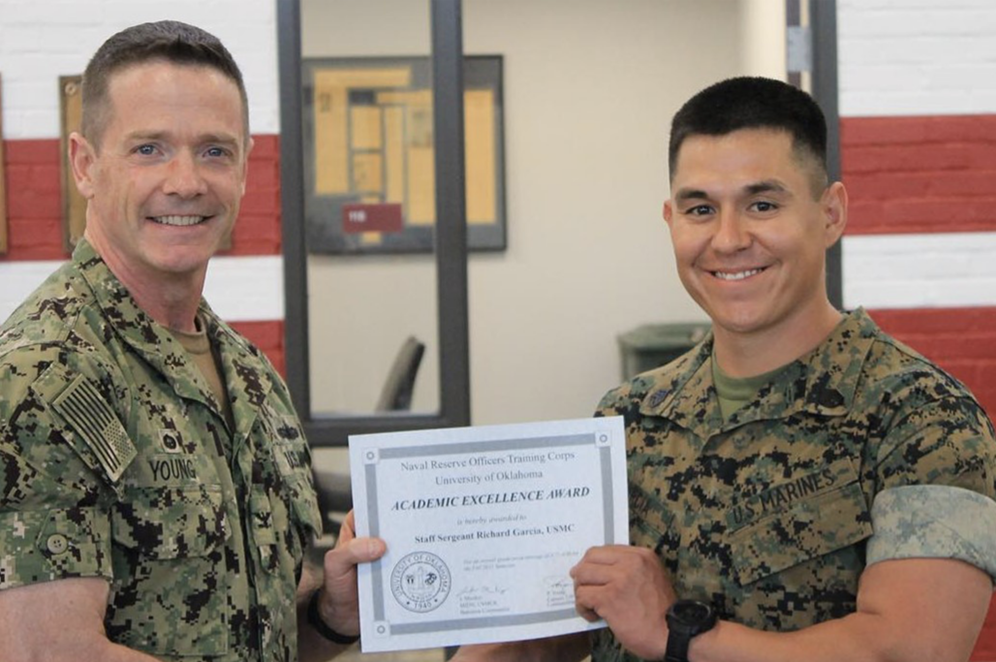 NORMAN, OKLA. – Staff Sgt. Richard Garcia, a senior majoring in geographic information science in the College of Atmospheric and Geographic Sciences’ Department of Geography and Environmental Sustainability at the University of Oklahoma, has been selected for the United States Marine Corps’ Cyber Officer Commissioning Program.