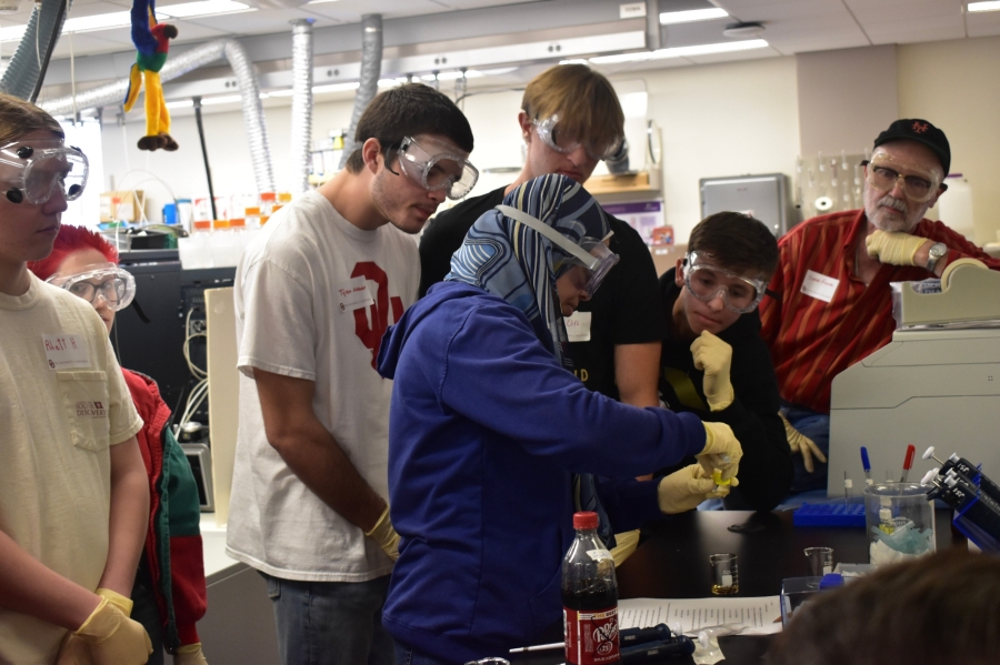 In the afternoon, Dr. Len Thomas and Graduate Student, Chhandosee Ganguly discussed X-ray crystallography, emphasizing protein structure determination. The students were given a tour of the Macromolecular Crystallography Lab (MCL). They were then back to the bench, this time in MCL, where they set up crystallization trays to grow their own Hen Egg White Lysozyme (HEWL) crystals. The students were then shown how X-ray diffraction data is collected and processed and how the molecular structure is determined and modeled.