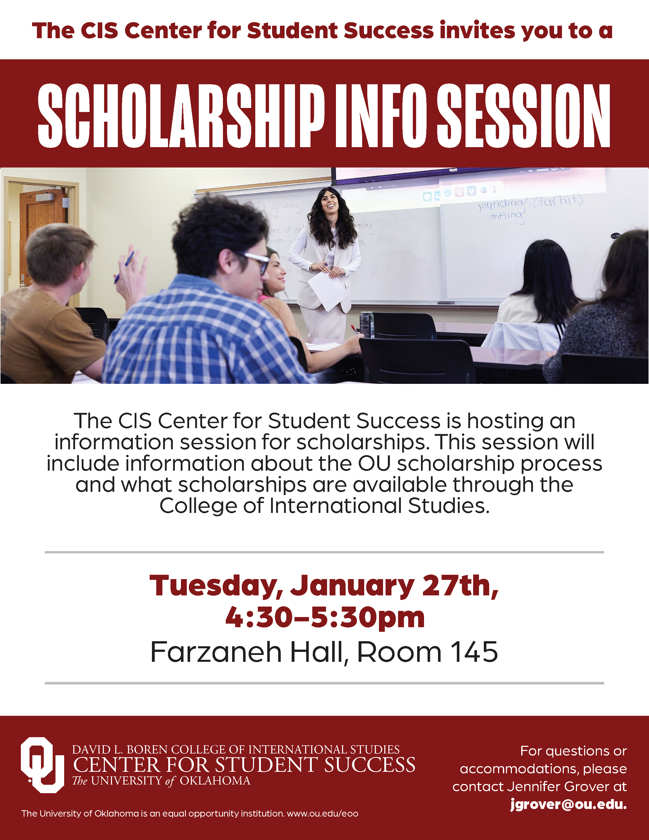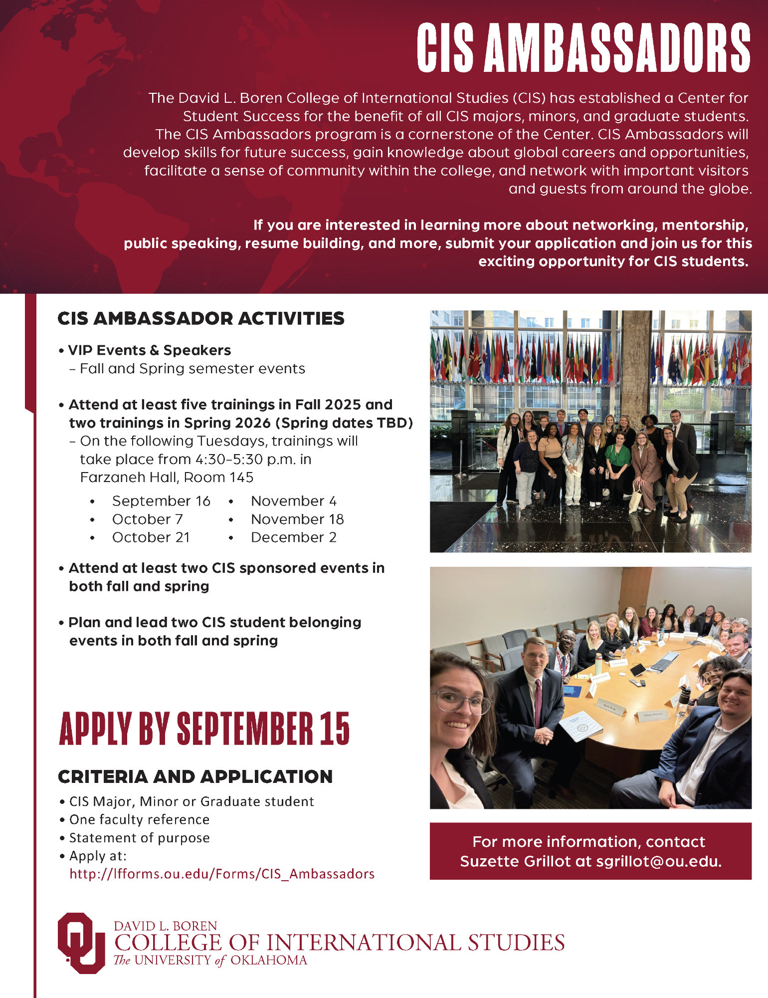 For questions regarding the ambassador program please contact Jennifer Grover at jgrover@ou.edu