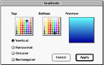 This is the gradients screen. Set up your gradient screen the same way this one has been set up; "Vertical" is checked, the top color is light blue (2 down and 3 from the right) and the bottom color is dark blue (bottom row, 3rd from the right). Click apply. You will now have a nice light to dark blue gradient as your background.