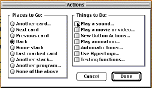 Make sure you are on the last card. Choose "last" from the "Move" menu. Choose "Add a Button" from the "Objects" menu. Set the button options Name: "Next", Type: Invisible, Check "Show Icon". When you check "Show Icon," a dialogue appears with several button icons. Choose the next arrow with the drop shadow. Click OK. Click OK again. Position your button in the bottom right hand corner of the card. Click outside of the button to position it. Choose "Next" from the "Places to go" choices. Choose a transition that you like. Click OK. Click "Play a sound" from the "Things to do" choices. The tape deck appears. To make a recording you first press the record button, say what you want to, and then press stop. Press "Record." Say the word "Next", press "Stop", then press "Play". You can now hear the sound you recorded. If you're not satisfied with it, repeat the procedure. When you have a sound that you are satisfied with, type "next" in the sound name field and press "OK." Click "Done." Choose the browser tool from the tools menu and try out your button.