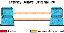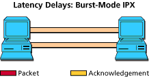 The bad effects of delay are magnified by bad end node protocols. The classic example is with NetWare's original use of the IPX protocol. Each packet sent requires an acknowledgment before the next is sent. In other words, each packet is delayed by the round trip latency time. In contrast, burst mode IPX will allow several packets to be sent before an acknowledgment is received. With proper tuning, end nodes can continually fill the available channel, and the total transaction stream gets delayed only by the one-way latency.