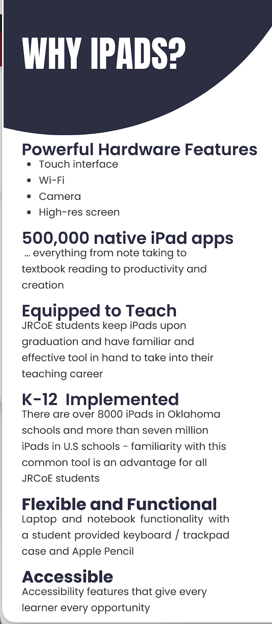 Once your student is a sophomore at JRCoE they will receive an iPad from the College of Education that will be theirs upon graduation.