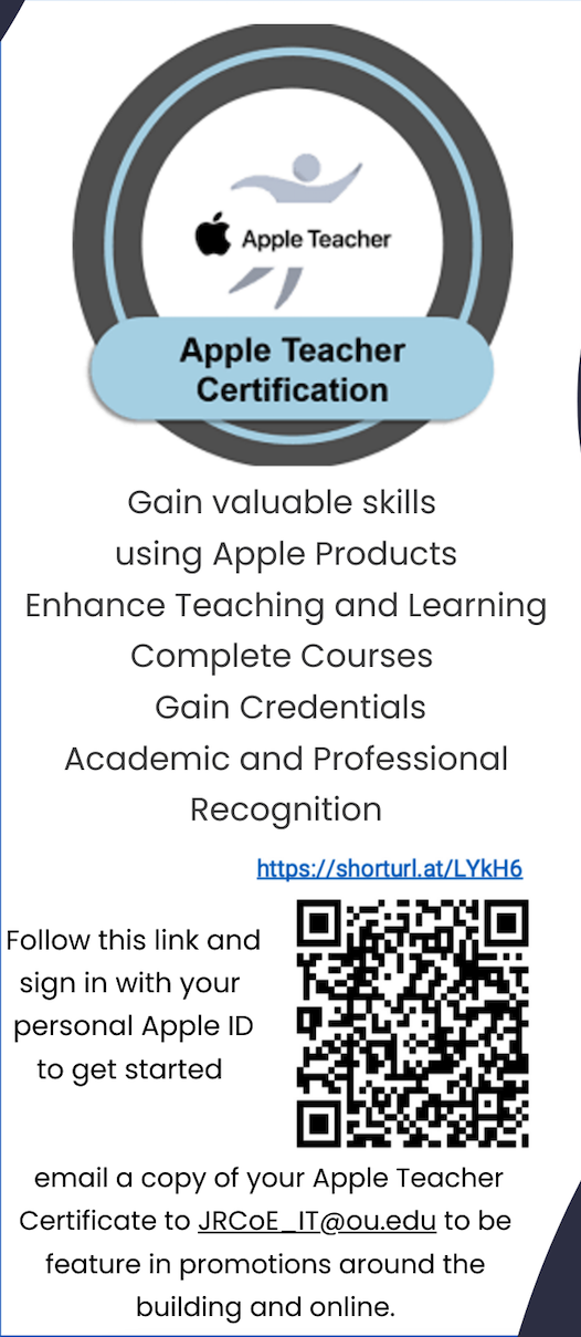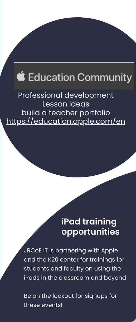 We are thrilled to facilitate Apple Teacher certifications for JRCoE students! This program provides valuable skills in using Apple products for educational purposes, enhancing both teaching and learning experiences. Students can enroll in various certification courses and gain credentials that will benefit them throughout their academic and professional careers. Visit education.apple.com to get started with your personal Apple ID. Students who complete the program will be featured in JRCoE IT promotions around the building.