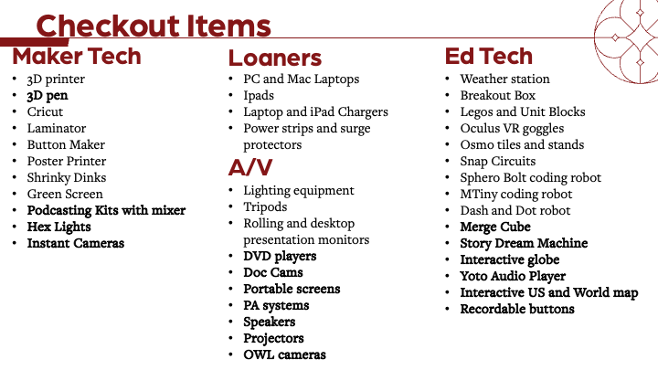We are excited to offer a variety of ed tech toys that can be used by classes, students, staff or faculty. These tools are designed to make learning fun and interactive and are available for checkout and can be reserved online.
