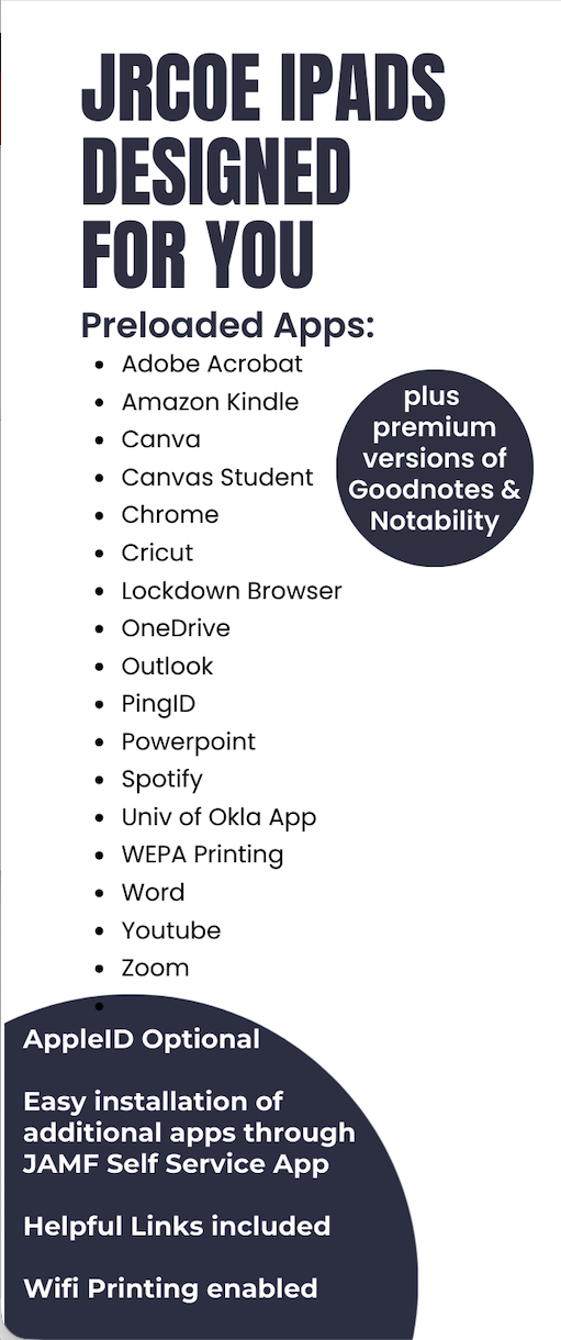 Every upperclassman undergraduate student at JRCoE is eligible to receive a free iPad that will be theirs to keep upon graduation. This JRCoE iPad program uses JAMF management, ensuring that all apps are securely and efficiently managed. This system allows for streamlined app distribution, updates, and maintenance, providing a hassle-free experience for both students and teachers. Eligible students will receive an invitation to the upperclassman orientation each semester with more information about iPad deployment.