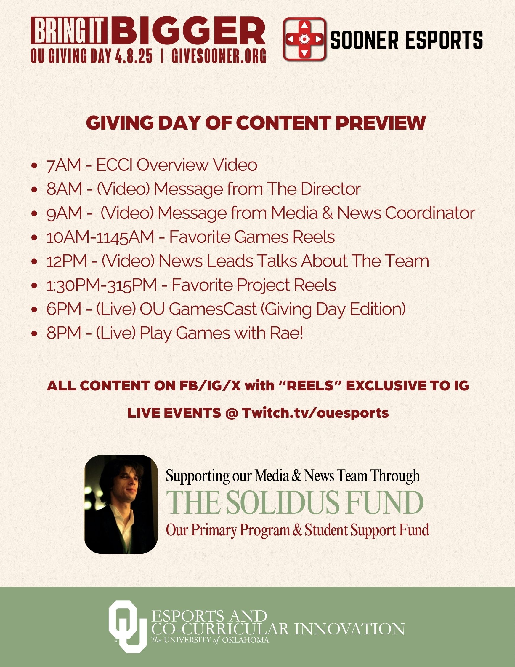 Welcome to The University of Oklahoma Esports & Co-Curricular Innovation Department (OU ECCI) in the Division of Student Affairs. Our mission is to personify gaming culture and esports communities. Fostering development and engagement for all fans of these topics alike, we leverage our influence to innovate the modernization of productivity and entertainment through the lens of gaming & esports.