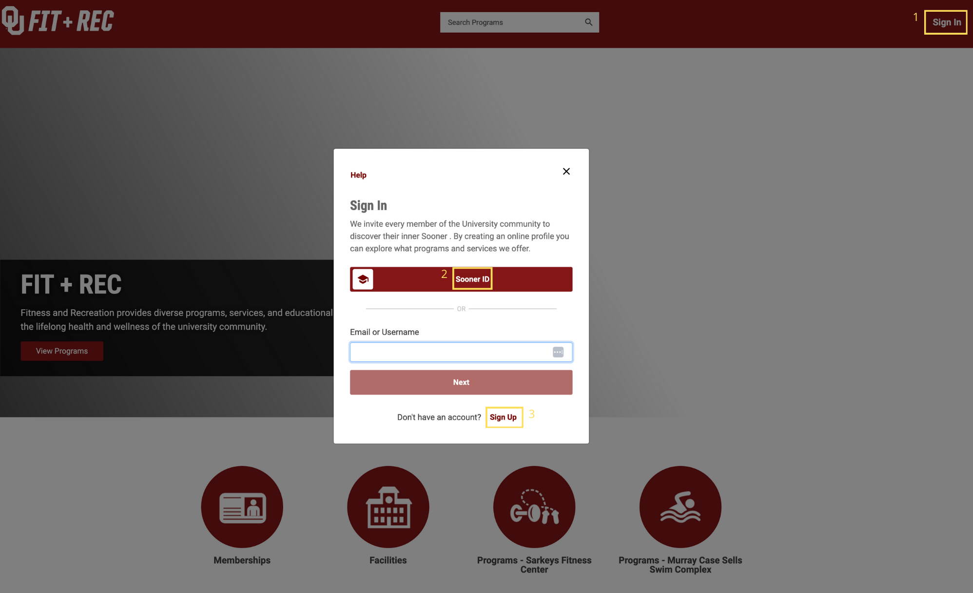 Step 3. All other guests please input your email below the Sooner ID button. If you have not created an account yet, you will click the signup button. Please see the below picture: