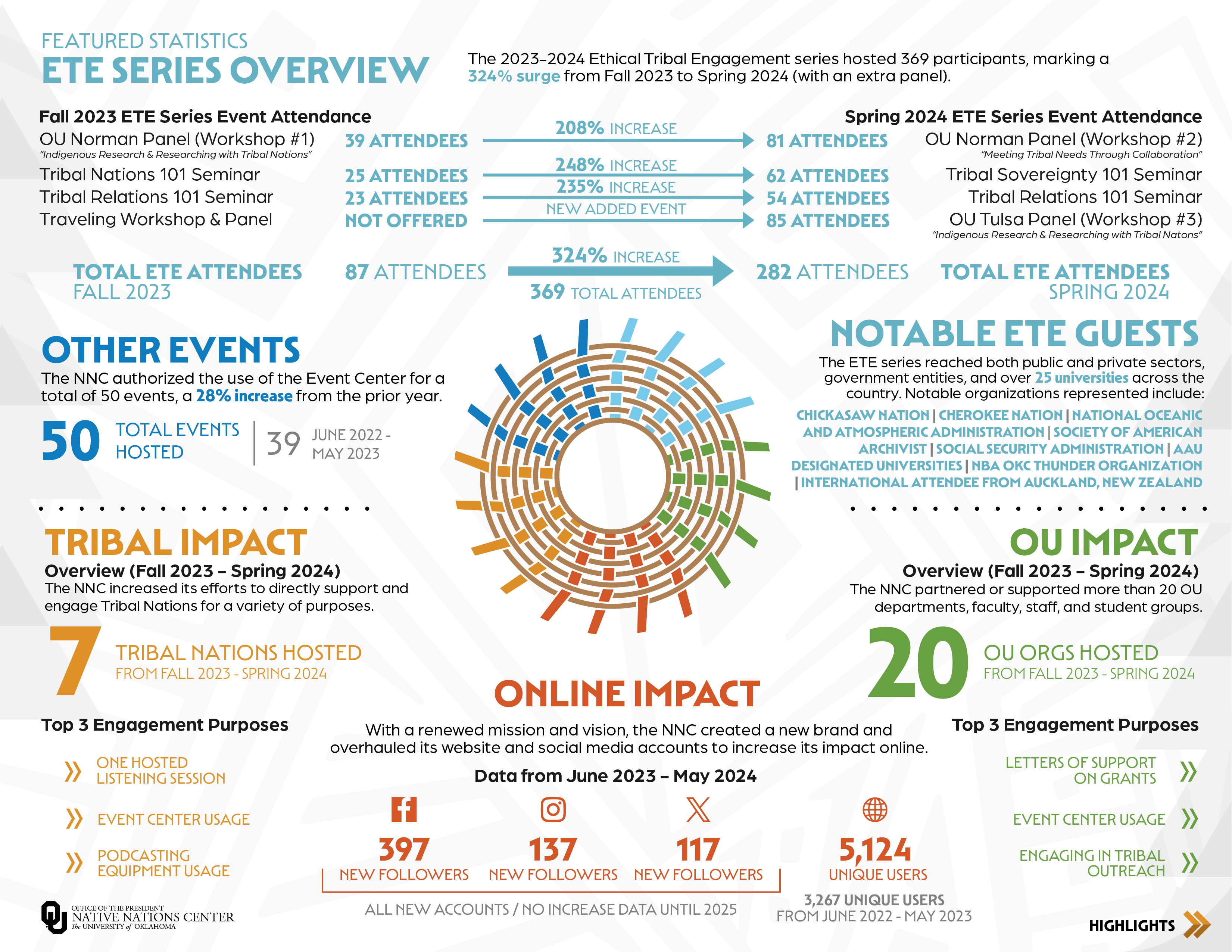The 2024-2025 Ethical Tribal Engagement Series is coming soon! Save the dates and join us throughout the year at OU Norman, OU Tulsa, and OU Health and Sciences Center for impactful... gatherings on ethical tribal engagement and collaboration. For more details and registration, visit nnc.events/ete. Follow us throughout the year as we roll out details about the ETE series!