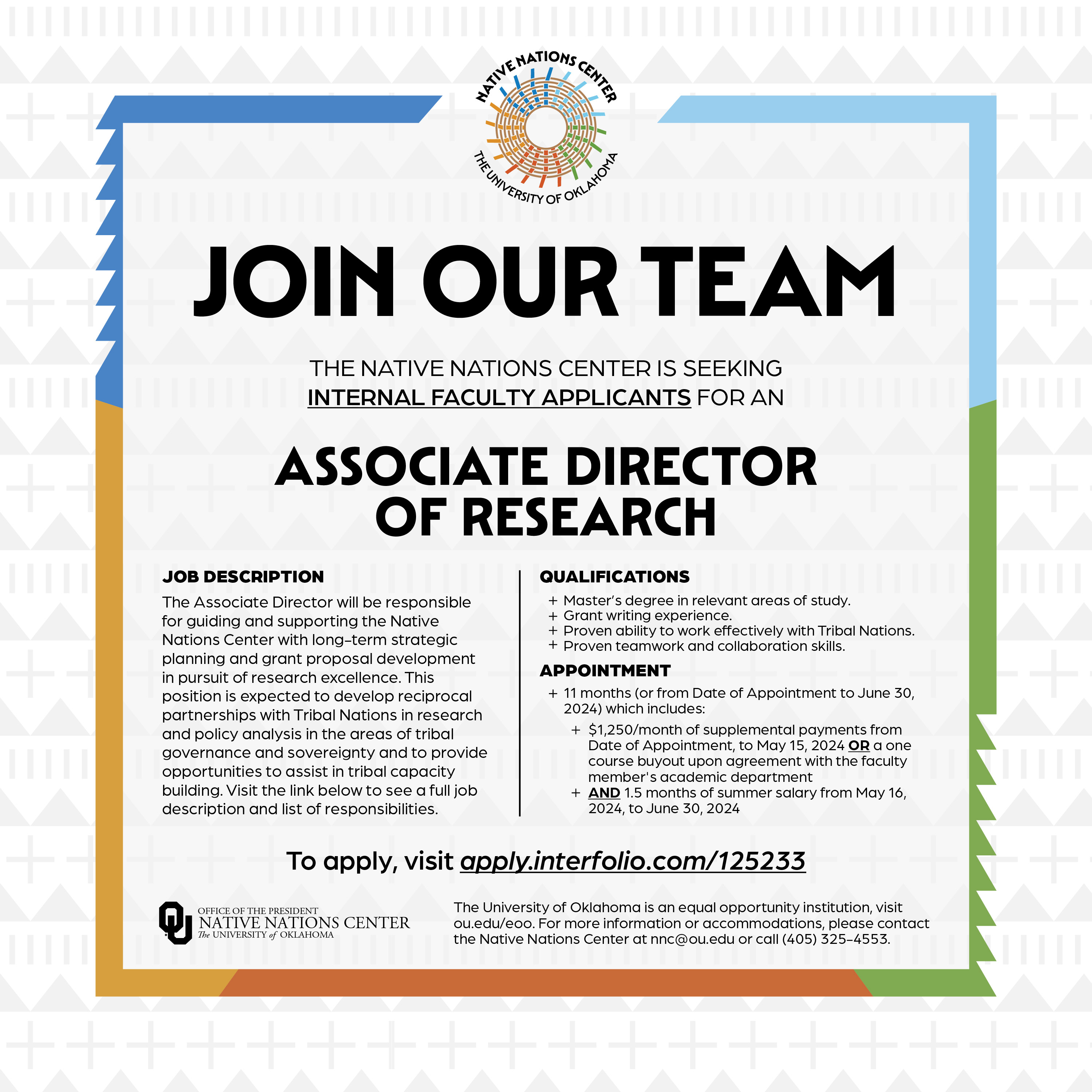 The Native Nations Center is thrilled to announce an exciting opportunity for an Associate Director of Research to join our team! We are currently seeking internal OU fac...ulty applicants. To see a full job description or to apply, visit https://apply.interfolio.com/125233