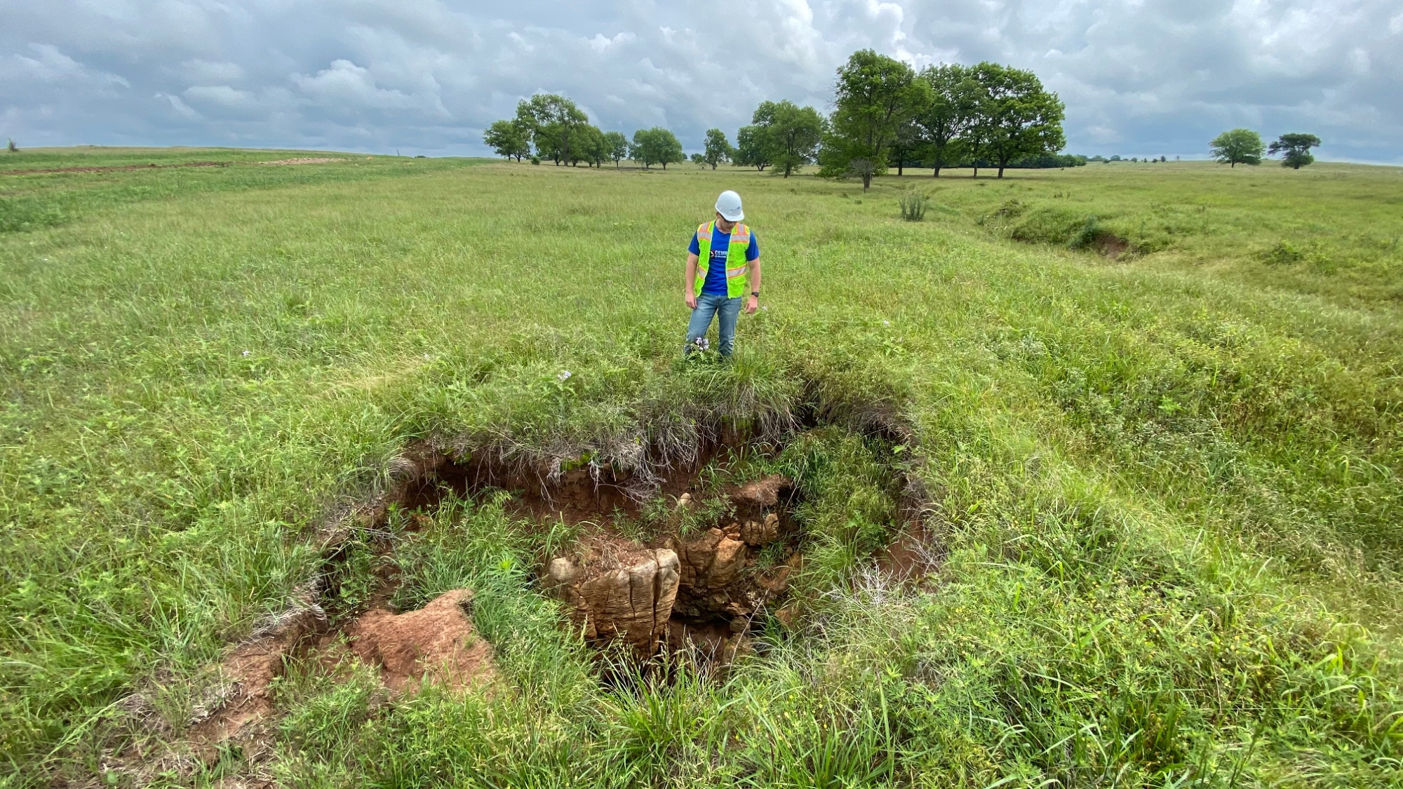 With all the recent rainfall (April 2025), experts at the Oklahoma Geological Survey are expecting an increase in the number of sinkholes appearing across the parts of Oklahoma most impacted by the rains. Most of these sinkholes are expected to be small and will probably occur where water was flowing beneath roadways and driveways, eroding soils supporting the weight of the road which then leads to load failure and collapse.