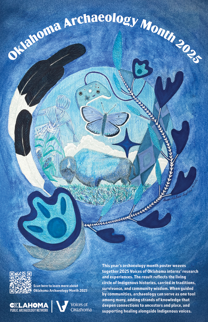 This year’s Oklahoma Archaeology Month poster was created in collaboration with OKPAN’s Voices of Oklahoma interns and Sac and Fox Nation artist Amber DuBoise-Shepherd. Over the summer, the interns presented their final projects centered on their individual interests in archaeology to Amber, sparking conversations that inspired this year’s theme. The poster celebrates living Indigenous histories expressed through traditions, resilience, and community wisdom and highlights archaeology as one tool, among many, for deepening connections between Indigenous people, their ancestors, and their heritage. To recommend a rising high school junior or senior for the 2026 “Voices of Oklahoma” class, click here.