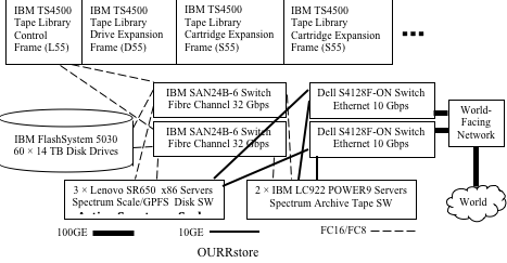 Tape drives, current: 6 × LTO-8 (can read and write LTO-8, LTO-7 Type M, LTO-7) PLUS 6 × LTO-9 (can read and write LTO-9, LTO-8)