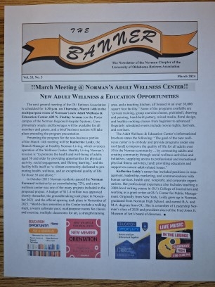 The Banner, the eight-page quarterly newsletter for members of the OU Retirees Association, is published each March, June, September, and December, in both black-and-white print and full-color digital editions for postal or electronic delivery respectively. Each issue contains a cover article detailing the program for the OURA's next general meeting, minutes of the previous general meeting and of the latest Executive Board meeting, a Treasurer's report, photographs from the previous general meeting, reports on upcoming activities of the OURA Book Club and the OURA Day Trekkers, and news items and announcements of general interest to OU retirees, including health insurance and related benefits.