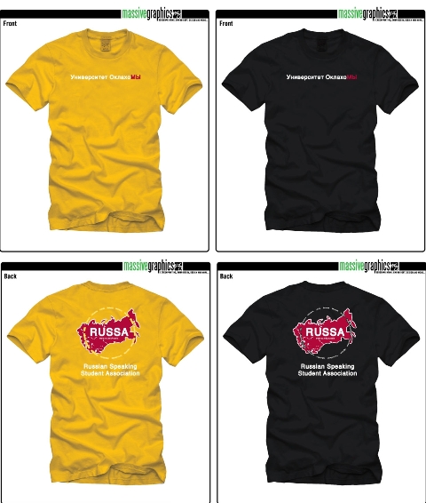 The new t-shirt design from RUSSA!!! You can pre-order these shirts NOW by emailing Roman Voronov at burn@ou.edu or by calling the cell phone 405-517-5739. Please include: the quantity, the sizes, and the color corresponding to each size that you want. The t-shirt price is $15.