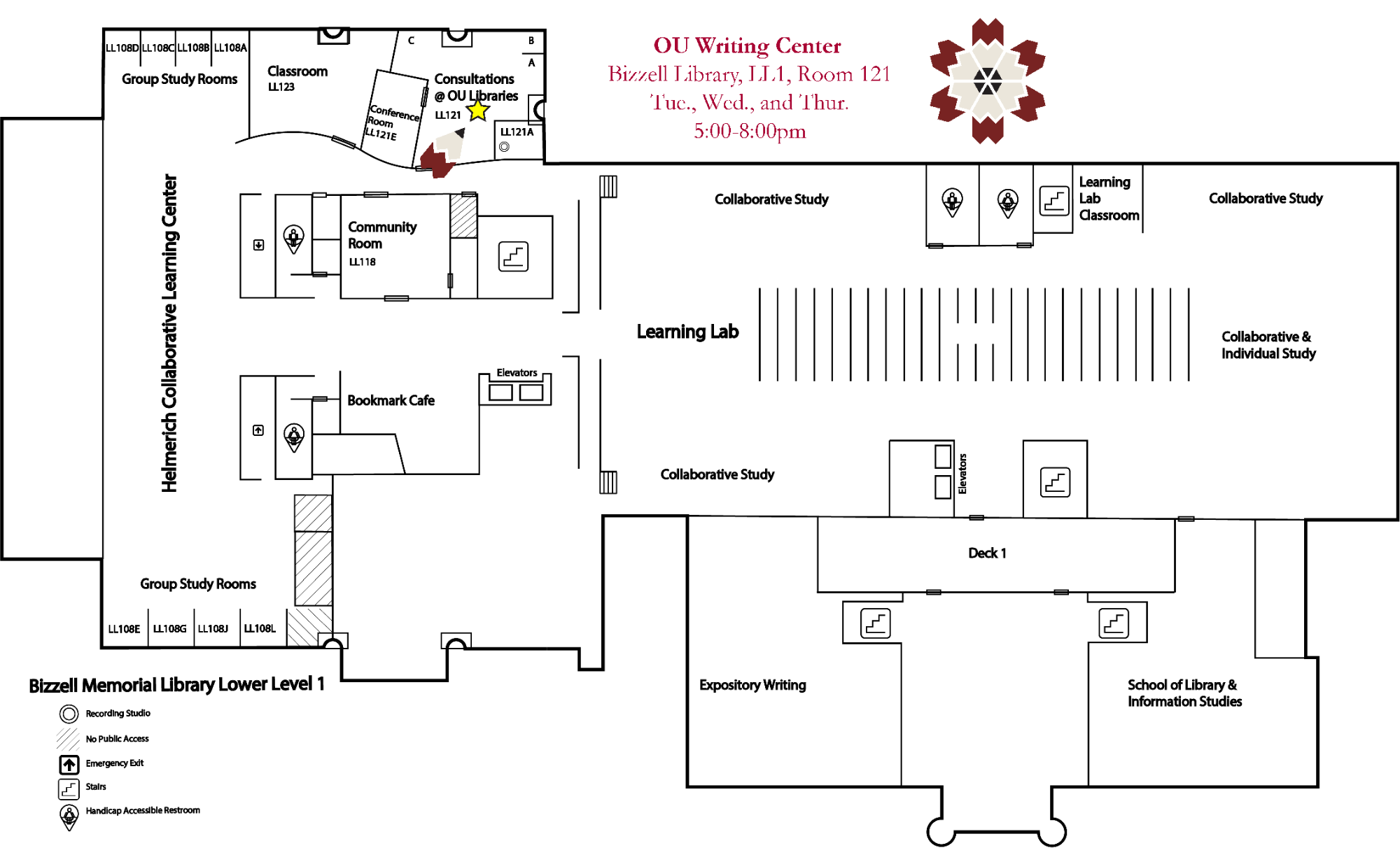 Bizzell is accessible with push-button door entry from the north entrance, closest to the Bell Tower. The consultation space is located in the newer library section, making the Bell Tower entrance the closest to our space. There are elevators throughout Bizzell, including in the main lobby of the newer section. For a video guide to our space in Bizzell, check out the YouTube video on this page above.