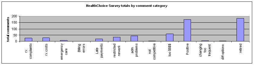 The most common complaints concerning prescription benefits relate to the cost of medicines and the restriction of coverage to a list of approved drugs. Of the 54 cost or coverage complaints, about half relate to cost and the other half to coverage. Few respondents mentioned the “prior approval” merry-go-round, but there were complaints that even after a physician recommended a particular drug, HealthChoice refused to approve it. One respondent said that he had switched to Pacificare because of the better prescription coverage. (On the other hand, at least one respondent said that he was able to obtain a waiver.) Limitations on time between refills were also mentioned by a few respondents. One recounted that his pharmacist had to break six pills from a blister pack of nine pills because of such requirements. Nevertheless, problems with prescription coverage are fairly limited. Of more than 300 responses, only 27 complaints related to this coverage. Nevertheless, to those whose doctor writes a prescription for a medicine not on the approved list, the “hassle factor” appears to be significant. Among retirees, the cost of prescriptions is the principal concern.