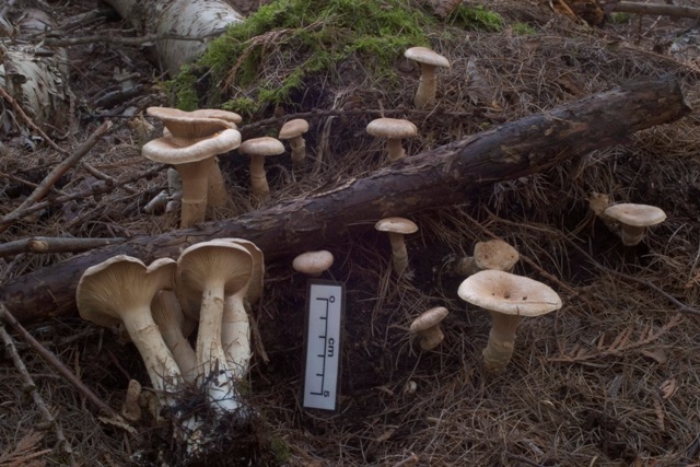 Finally, we had to determine whether or not the "spring C. subvelosa" from Metaline Falls was the same as Cleistocybe gomphidioides. First of all the "spring C. subvelosa" is known from only a single locality and likely is rare, in comparison to C. gomphidioides a summer and fall species, more widespread but rarely collected. In addition, the cap cuticle in the "spring C. subvelosa" is not gelatinous as it is in C. gomphidioides, and the basidiospores of the former are somewhat smaller and more elliptical, although the basidiospore features will require further study of additional populations to be sure they are meaningful. The cap surface of fresh specimens of "spring C. subvelosa" turns green with the application of KOH, however, this has not been tested for C. gomphidioides. ITS sequences of the "spring C. subvelosa" and C. gomphidioides differ at 76 nucleotide positions (excluding gaps) among 605 non-gapped sites (648 total aligned sites). The genetic or "p" distance between the two species at the ITS locus is 12.5 %. Thus the vernal occurrence, nongelatinous cap cuticle, and ITS data serve to distinguish "spring C. subvelosa" from C. gomphidioides. Thus it was described as a new species, Cleistocybe vernalis Amm., Parker & Matheny (see also Parker 2007).