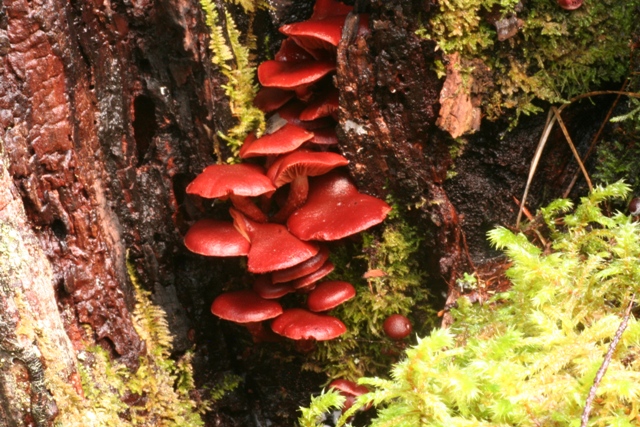 In winter 2005/2006 we found eight sites with the red mushroom, five of which were on DND property. We collected enough material from a relatively large area (Cobble Hill to Rocky Point) to enable our colleagues to study its morphology. One of us (Oluna Ceska) was invited to be a co-author of a paper that would clarify the taxonomy of this group of mushrooms.