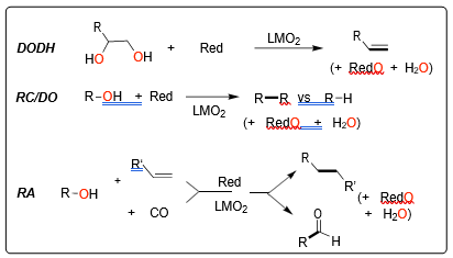 The most abundant of renewable resources, e.g. cellulose and plant oils, are highly oxygenated, so their conversion to useful chemicals or fuels often requires partial/complete oxygen removal/replacement. Our overall objective is to develop new catalytic reactions for the removal/refunctionalization of alcohols and polyols to produce value-added products. Our recent work has lead to: 1. new catalysts and reagents for deoxydehydration of glycols (DODH, Scheme) with oxo-rhenium (O=ReL) and cheaper oxo-vanadium (O=VL) catalysts; 2. novel Re- catalyzed reductive coupling (RC) reactions of activated alcohols via free-radicals; 3. efficient Re-promoted radical additions of alcohols to alkenes; and 4. insights into the mechanism of these reactions through experimental and DFT computational modeling of the reaction pathways. We are now seeking to: 1. design and prepare new earth-abundant TM compounds to facilitate the above deoxygenation reactions; 2. develop new more general reductive C-C bond-forming reactions; 3. to establish catalyst structure/reactivity relationships and reaction mechanisms that identify key intermediates and transition states through a combined experimental and computational molecular modeling approach.