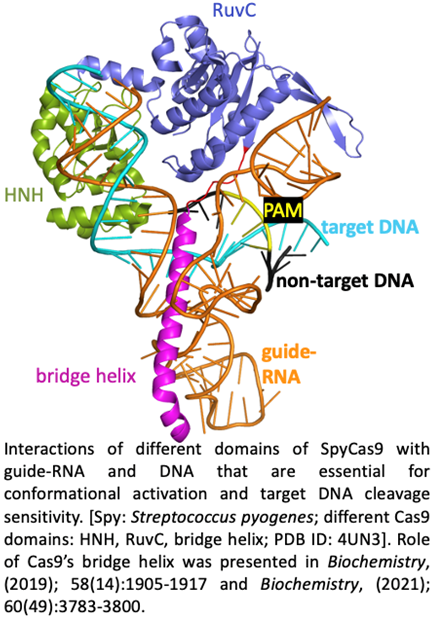 The long-term goals of our laboratory are to decipher the atomic interactions and conformational changes of Cas protein-nucleic acid complexes to enable development of high-fidelity CRISPR-Cas systems for genome applications. Towards this, we are focusing on the structure and mechanisms of Cas9 and Cas12a, two proteins that are widely used for genome applications and diagnostics purposes. Another area of focus is determining the protein-DNA interactions essential for site-specificity during CRISPR adaptation, the process by which bacteria and archaea insert a piece of the intruder genome into the CRISPR locus to offer future immunological protection against that specific intruder. We also are interested in understanding alternate functions of CRISPR systems in bacterial physiology, for example, the contributions of CRISPR-Cas systems towards enhancing the pathogenicity and virulence of bacteria. We incorporate molecular biology, biochemistry, X-ray crystallography, bioinformatics, and additional biophysical and computational tools to study CRISPR-Cas systems.