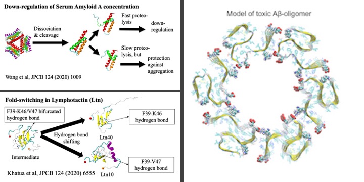 Rational drug design or the pathology of various diseases such as cancer or Alzheimer’s require an understanding of the workings of cells on a molecular level. However, despite the remarkable progress in experimental machinery and techniques for producing and characterizing proteins, a detailed understanding of fundamental processes of protein folding, aggregation and interaction in a cell is still missing. Simulations can complement experiments and trace these processes, but unfortunately the numerical difficulties grow exponentially with the size of the system. This is because the complex form of the forces within and between proteins leads to a rough energy landscape with a large number of local minima acting as traps. Our lab develops algorithms and software to overcome this bottleneck and enable efficient simulations of large biomolecules. Examples are generalized-ensemble sampling and replica exchange techniques and our software package SMMP. We use these techniques developed in our lab to probe the mechanism of folding in selected small proteins and the conditions by which proteins mis-fold and aggregate. The later processes are often related to the outbreak of neurological and other diseases, and choice of the systems that we study is often motivated by their medical or pharmaceutical relevance. Protein-ligand binding and protein interaction networks belong to the same research direction and provide an interface for collaborations.