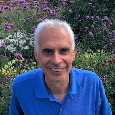 A photo of Eddie Baron sitting in front of a flower garden.