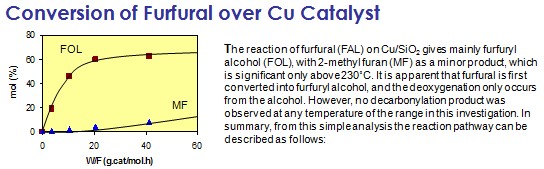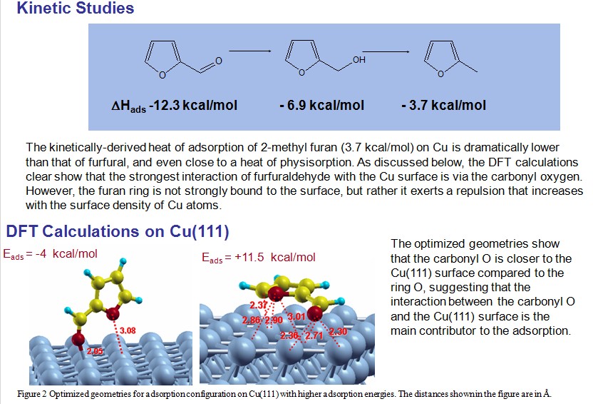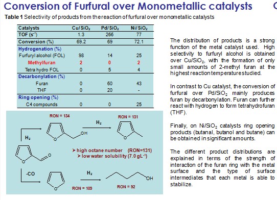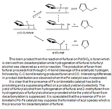 Molecular engineering of biofuel components requires a fine control of the surface chemistry to maximize the yield of the desired molecules. This study illustrates how a detailed knowledge of the nature of adsorbed species on different metal surfaces leads to tailored catalysts with the desired properties. In this case deoxygenation of biofuel components has been achieved with minimal reduction of carbon yield. For example, monometallic Pd catalyst is highly active for decarbonylation of furfural, a main aromatic aldehyde of biomass-derived feedstock, by C-C bond cleavage yielding furan and CO as the dominant product. However, the role of the bio-oil upgrading process is not only to eliminate O, but also to retain C in the liquid preferably by the cleavage of C-O bond. In this regard, bimetallic alloy catalysts may be interesting systems because the typically strong interaction of oxygen atom with Group VII metals can be increased. For example, the addition of Fe to Pd forming Pd-Fe alloy can dramatically change the product selectivity from furan to methyl furan. This can be explained by a stronger interaction of the Pd-Fe bimetallic catalysts with the O atom, making the C-O bond cleavage more favorable, leading to production of methylfuran.