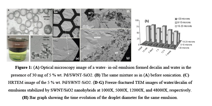 A more detailed characterization of the structure of these emulsions using optical and electron microscopy have been undertaken (Figure 1A-B). The SWNT-Metal Oxide nanohybrids characterized above were found to efficiently stabilize emulsions from oil/water mixtures. Figure 1(D, E, F, and G) showed the HRTEM images of the Platinum-Carbon replica obtained from the Freeze-Fracture of the emulsion stabilized by SWCNTSiO2
