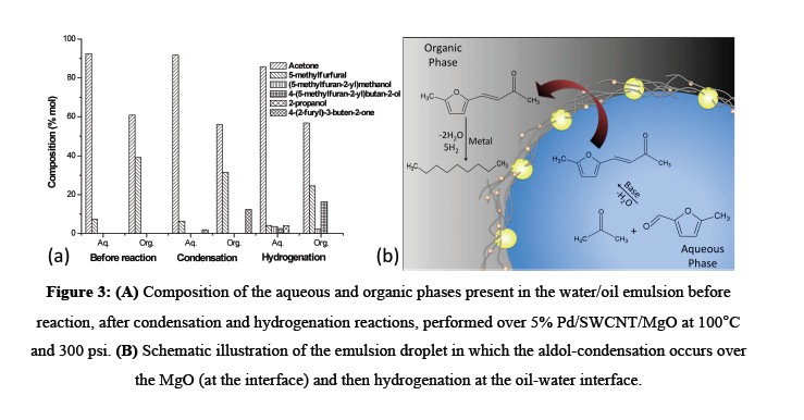 nanohybrids instead of silica. Although, the utilization of MgO, during the nanotube synthesis, generates a SWNT product that contains about 20% Multiwalled carbon nanotubes (MWNTs) as an impurity, the MgO is crucial to impart the basicity to the nanohybrids for the aldol-condensation reaction. Moreover, this nanohybrid contains nanotubes that are more defective (MWNTs) and is able to stabilize Pd particles not only on the hydrophilic side but also on the hydrophobic side. Therefore, hydrogenation can occur on both sides of the emulsion. As represented in Figure 3A, first was ran the reaction under N2 at 80°C for 3 hours and analyzed the products, which is indicated as condensation, in which no hydrogenation occurs. Self-condensation of acetone was not observed. As a result, the major product was 4-(5-methylfuran-2-yl)buten-2-one, which in line with its high log P value (~1.5) migrated almost completely to the organic phase (Figure 3B). In the second experiment, indicated as hydrogenation, an additional 1-hour reaction step at 100°C under H2 flow was added to the initial 3 hours at 80°C under N2. The 4-(5-methylfuran-2-yl)buten-2-one is totally hydrogenated in the second step, indicating that hydrogenation has occurred in the organic phase as well as in the aqueous phase. As shown in Figure 3B the carbon chains migrate to the organic phase after growing long enough to become hydrophobic, facilitating their isolation as desirable products, whereas the shorter chains remained in the aqueous phase to undergo further growth. This allow us to achieve a maximum recovery of the hydrocarbons present in the aqueous phase, that otherwise would be lost in a conventional processing scheme.