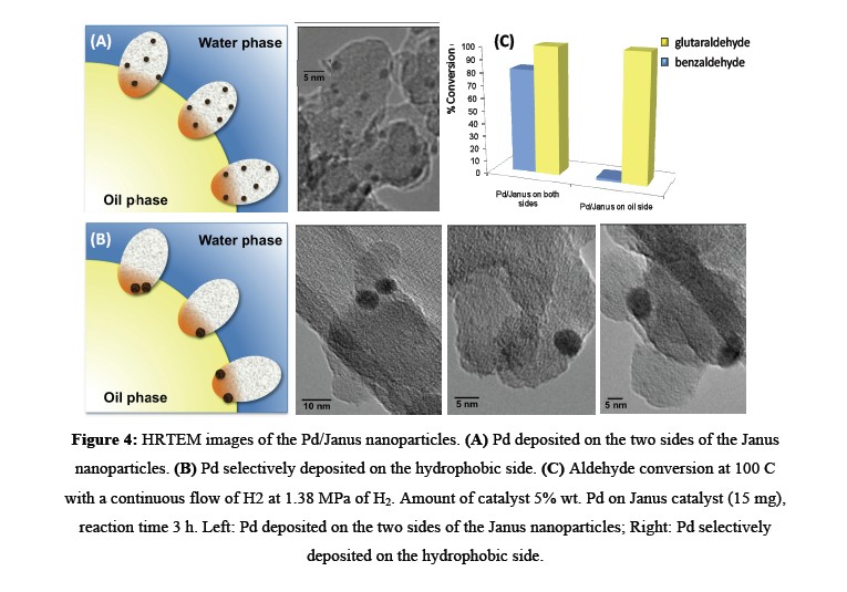 particles, deposited on one side of each silica particle (6 nm). The lower density andlarger size of Pd clusters in the second preparation can be explained by: (i) a smallerfraction of support surface available for Pd deposition, and (ii) a decreased anchoring ability of the silica support as a result of the functionalization, making sintering of themetal clusters more favorable during calcination. As shown in Figure 4C, the differencesin behavior were dramatic. When the catalyst contained Pd on both sides of the Janus particles, high conversion levels were obtained for both reactants, about 80% for glutaraldehyde in the water phase and 100% for benzaldehyde in the oil phase. However,