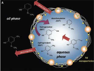 The catalytic application of the Pd-containing nanohybrids to phenolic hydrodeoxygenation in a water-in-decalin emulsion was tested using vanillin (4-hydroxy- 3-methoxybenzaldehyde) as the substrate molecule, as this is a common component of pyrolysis oil derived from the lignin fraction. This compound was appealing for this