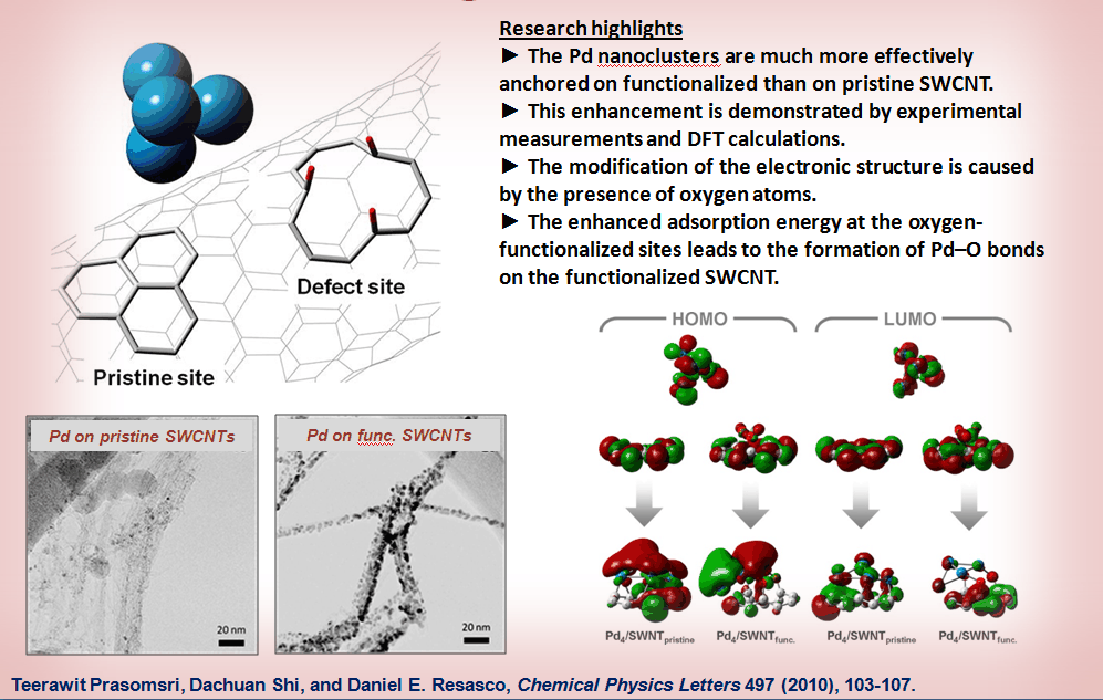 In a recent article from Chemical Physics Letters we reported that the the dispersionof Pd nanoclusters on single-wallcarbon nanotubes (SWCNT) can be enhanced by creating defects on the nanotube walls, which lead to a stronger metal–support interaction. The ONIOM (DFT:MM) calculations show that the binding energy of Pd is significantly enhanced when the SWCNT surface is oxygen-functionalized, compared to the case of the pristine SWCNT surface. The electronic interaction of Pd atoms with oxygen at the defect sites results in a stronger bonding. These calculations are consistent with experimental measurements. Microscopy images clearly show that the functionalized SWCNT surface is much more effective than the pristine surface in anchoring Pd nanoclusters