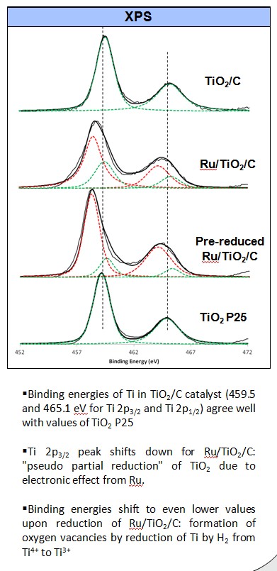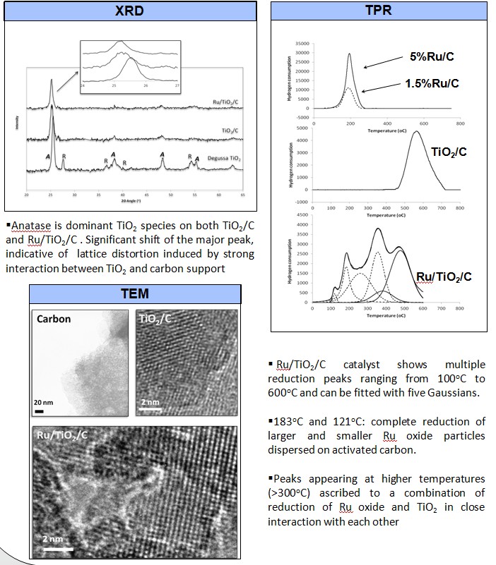 The results reported here indicate that the combination of Ru, TiO2, and activated carbon (Ru/TiO2/C) creates a unique catalyst system with potential for reactions in hot liquid acids. Several characterization techniques were employed (XPS, TPR, TEM) to investigate the interactions of the three components. They provide fairly detailed information about the structure and functionality of this catalyst.