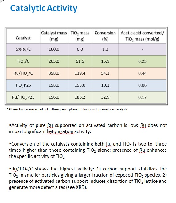 Ketonization of acetic acid in the liquid phase using TiO2/C and Ru/TiO2/C catalysts have been investigated. High surface area of activated carbon can enhance the dispersion of TiO2 particles, and increase the adsorption of acetic acid in water. In addition, the hydrophobicity of the carbon support can impede the interaction between the active species and water molecules, even in aqueous media. On the other hand, Ru significantly improves the reducibility of TiO2, creates more oxygen vacancies, and consequently its ketonization activity.