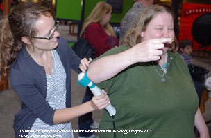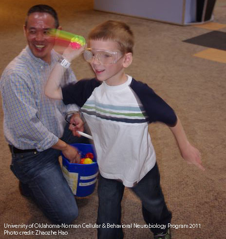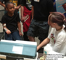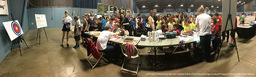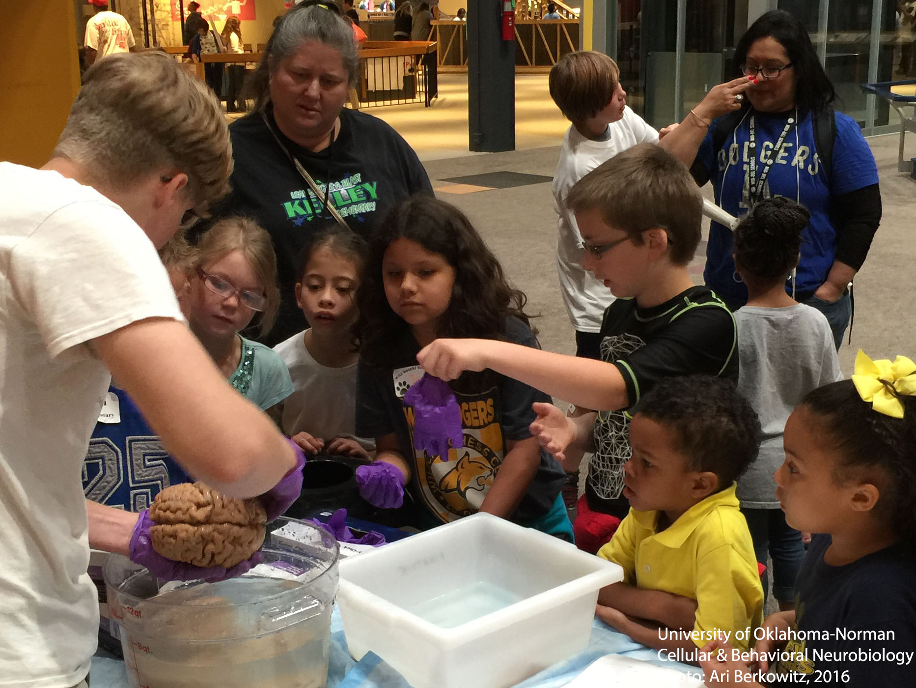 Each year, CBN faculty members, students, and other volunteers lead hands-on outreach activities to engage and teach people about the nervous system. We participate in multiple events each year, including the Women in Science Conference in Oklahoma City and our own Brain Awareness Week event at Science Museum Oklahoma in Oklahoma City. Visitors to our exhibit can see and touch a real human brain, experience how their brain changes the way they throw as a result of wearing prism goggles, see and hear electrical signals from their own muscles, experience a proprioceptive illusion, and see how important synapses are by observing fruit flies with a temperature-sensitive mutation of a synaptic protein.