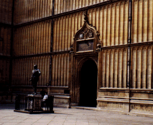 The initial formal admission process takes about a half hour. You will need a piece of identification (a passport, etc.), a letter of introduction (if you are a student), and 10£. This will get you unlimited use for six months or 12 visits in a four year period (each visit is good for the whole day). After reading their agreement out-loud and getting your card, exit the office and turn right. Go through the courtyard, through an arch into another courtyard and turn right. There is a statud of Thomas Pembrochiae before the doors: