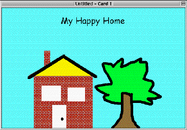 Now that you've got a feel for the drawing tools, we're going to draw a picture for the first card of the stack you will be creating. Use "Select All" and delete to clear the card of any drawing. Using the Text tool, write "My Happy Home" across the top of the screen, roughly in the center of the screen. Using the draw tools, draw a house and a tree in the bottom area of the screen. You can change the font size and style by double clicking on the text tool in tool menu. You can change the thickness of lines for the line tool or the shapes by double clicking on the line tool in tool menu.