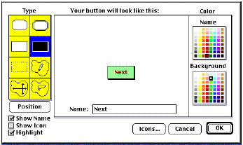 This is a cumbersome way to navigate through your cards though. We are going to add some navigation buttons right on the cards. Choose "Add a Button" from the "Object" menu. The button dialog will come up. Type "Next" in the name field. Under Color, choose a color for the name and for the button background. Under Type, choose one of the top 4 button shapes. The button dialogue looks like this;