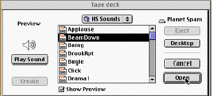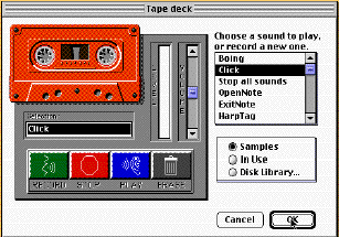 You will now see the tape deck. Here you can play and record sounds. Right now we're just going to choose an existing sound. Choose a sound (we chose "Click" in the example below) from the menu of sounds.