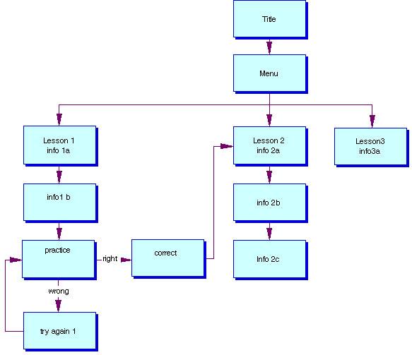 This example is very simple and is incomplete, but it should provide an idea of the basic structure of the corresponding CAI lesson. Each cell in the flowchart corresponds to one screen of the program.