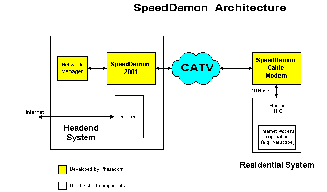The SpeedDemon Network architecture consists of the SpeedDemon 2001, a headend network controller, a router, and the SpeedDemon cable modems.