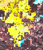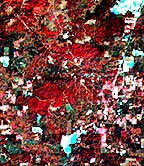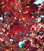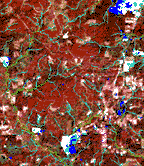 multi spectral, infra-red image shows forested areas in red. Developed
