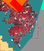 (urban) areas in pink, water (with suspended sediment) in light aqua, and