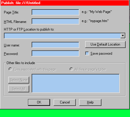 Select the "all files in page's folder" option to display all of the files (.HTML, .GIF, .JPG) in the current doucment's directory. Then select the files you want to publish along with the document.