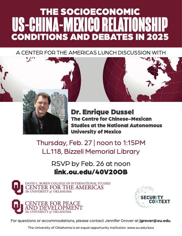 The OU Center for Peace and Development and Security in Context Present:Self-Devouring Growth A lecture with Dr. Julie Livingston Silver Professor of Social and Cultural Analysis and History at New York University, author of Self-Devouring Growth: A Planetary Parable as Told from Southern Africa (Duke University Press, 2019) Wednesday, February 24, 2-3 p.m. Zoom + Facebook Live @oucis Join Zoom webinar at https://oklahoma.zoom.us/s/92812186338.  Moderated by Dr. Daniel Mains, Associate Professor of Anthropology and African Studies, University of Oklahoma. The lecture will be followed by a Q&A. Self-Devouring Growth A lecture with Dr. Julie Livingston Silver Professor of Social and Cultural Analysis and History at New York University, author of Self-Devouring Growth: A Planetary Parable as Told from Southern Africa (Duke University Press, 2019) Wednesday, February 24, 2-3 p.m. Zoom + Facebook Live @oucis Join Zoom webinar at https://oklahoma.zoom.us/s/92812186338 The OU Center for Peace and Development and Security in Context Present: For accommodation on the basis of disability contact stephaniesager@ou.edu.