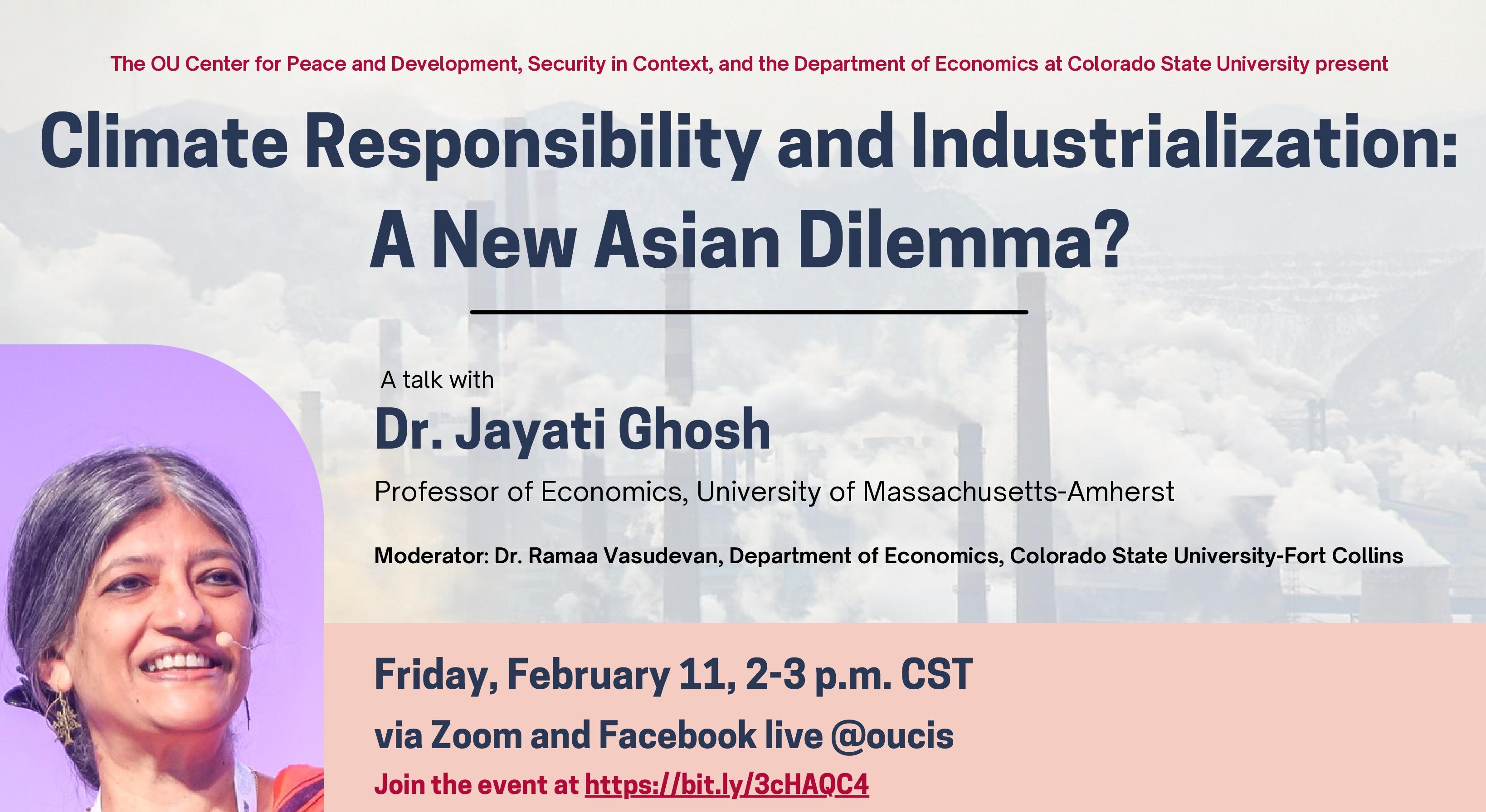 The OU Center for Peace & Development and Security in Context present Climate Change in an Unequal World The OU Center for Peace & Development and Security in Context present with James K. Boyce Emeritus Professor, University of Massachusetts Amherst. Moderated by Firat Demir, L.J. Semrod Presidential Professor of Economics, University of Oklahoma. James K. Boyce is an emeritus professor at the University of Massachusetts Amherst, where he is also a senior fellow at the Political Economy Research Institute. He isthe recipient of the 2017 Leontief Prize for Advancing the Frontiers of Economic Thought. He isthe author of 18 books, most recently The Casefor Carbon Dividends (2019, Polity Press) and Economics for People and the Planet: Inequality in the Era of Climate Change(2019, Anthem Press). Thursday, November 4 2-3 p.m. CST/3-4 p.m. EST via Zoom and Facebook Live @oucis Join this webinar at https://bit.ly/3kM38ie.For accommodation on the basis of disability contact stephaniesager@ou.edu..