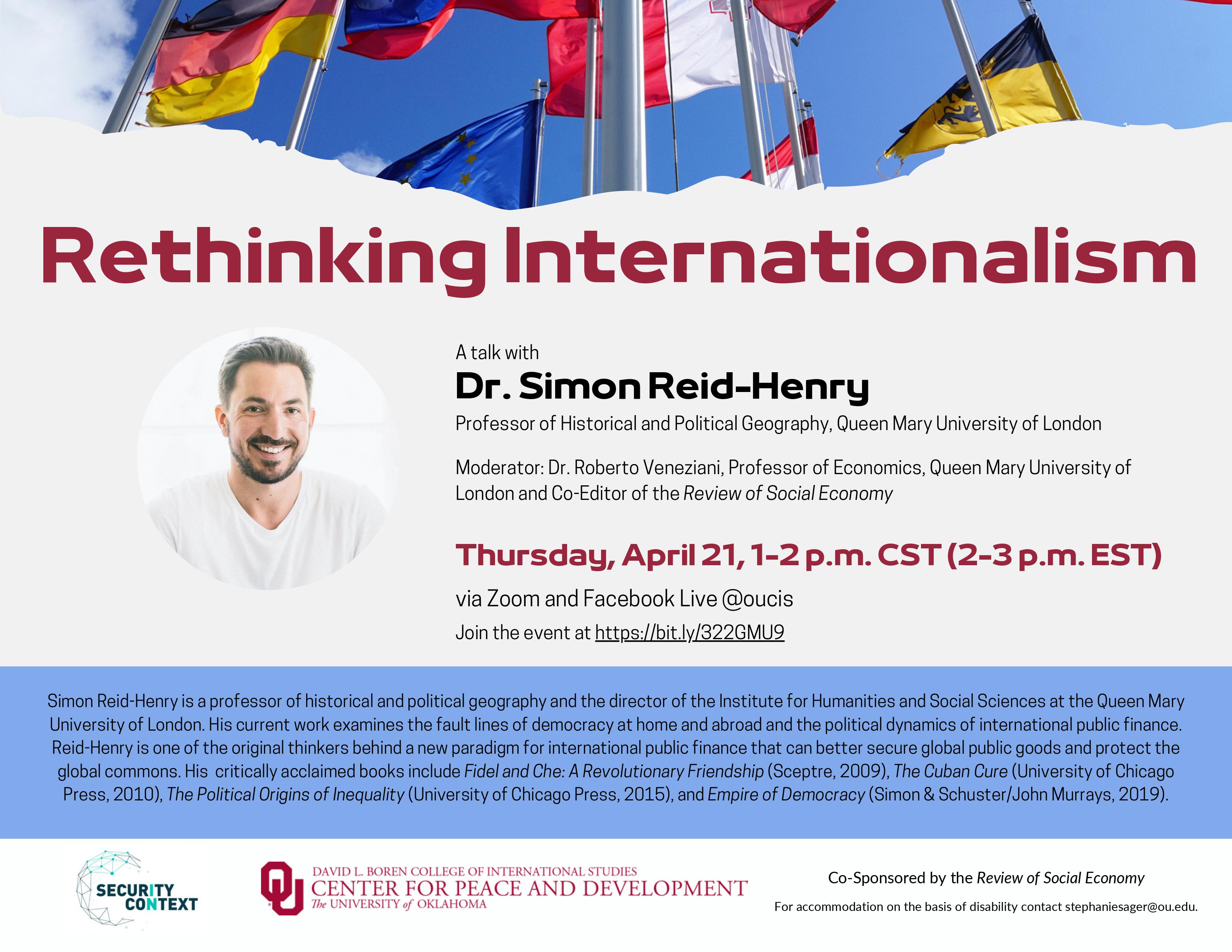 The IMF and How Billions of People Can Benefit from a Simple, Costless Act of Congress (and Why You Should Care) with Dr. Mark Weisbrot Co-Director, Center for Economic and Policy Research. Moderated by Firat Demir, L.J. Semrod Presidential Professor of Economics, University of Oklahoma. Thursday, October 14, 1-2 p.m. CDT via Zoom Join the webinar at https://bit.ly/3zJ4n7u or stream live on Facebook @oucis & @SICincontext.Dr. Mark Weisbrot is Co-Director of the Center for Economic and Policy Research in Washington, D.C. He is author of the book Failed: What the “Experts” Got Wrong About the Global Economy (Oxford University Press, 2015), and has written numerous research papers on economic policy. His opinion pieces have appeared in the New York Times, Washington Post, Los Angeles Times, Guardian, and almost every major U.S. newspaper. For accommodation on the basis of disability contact stephaniesager@ou.edu..